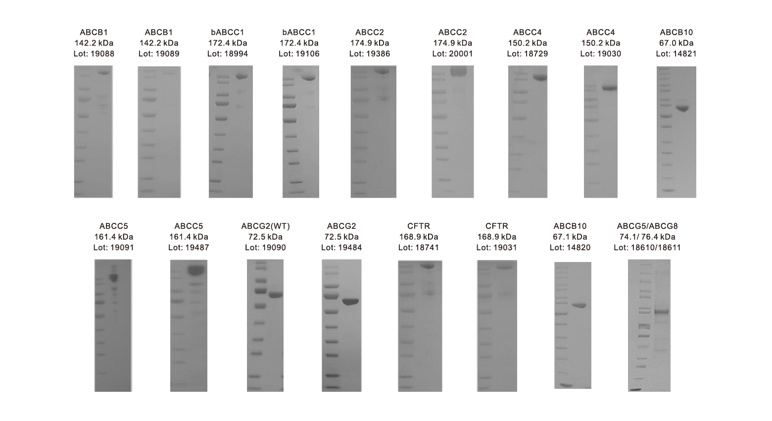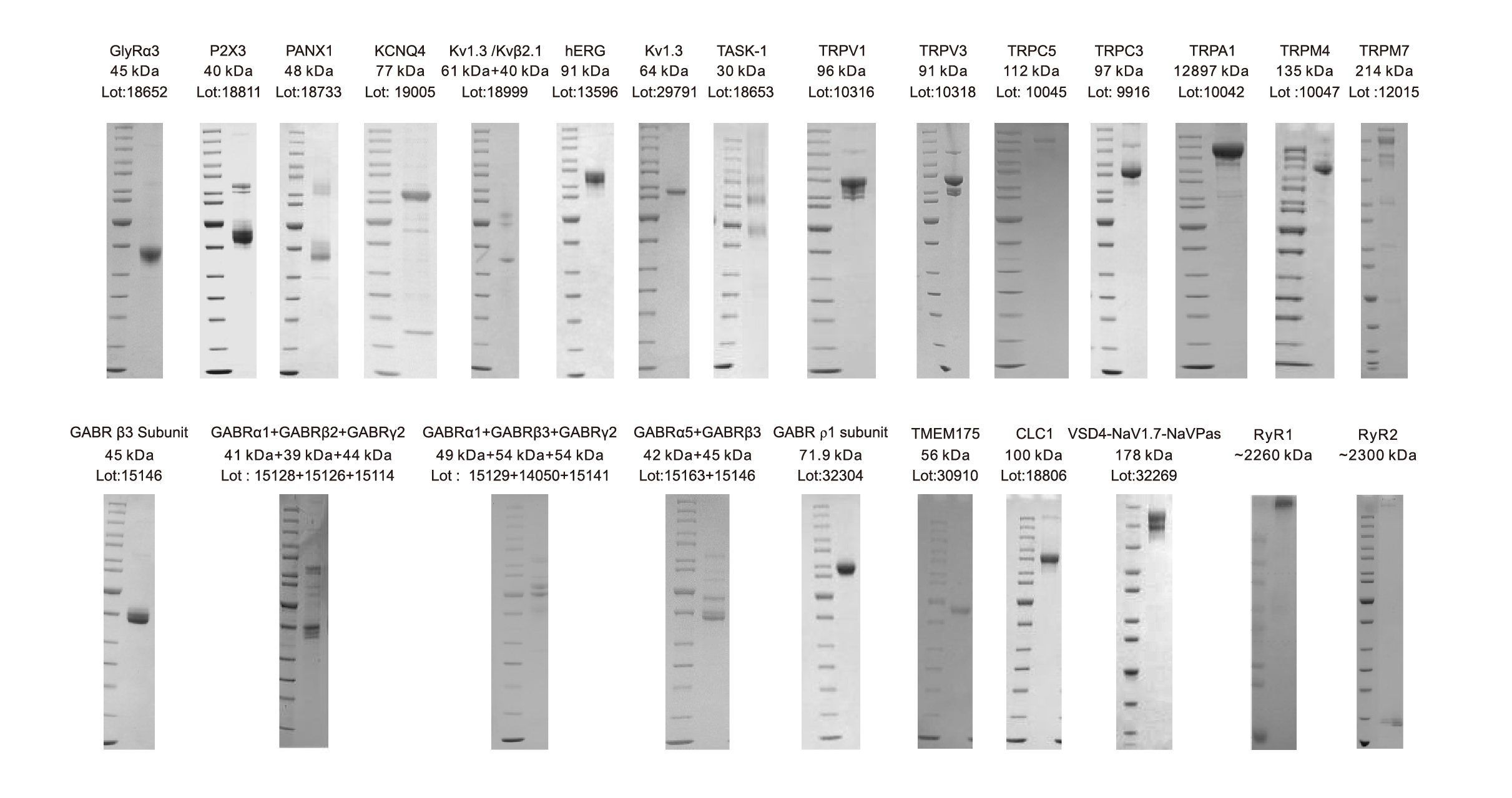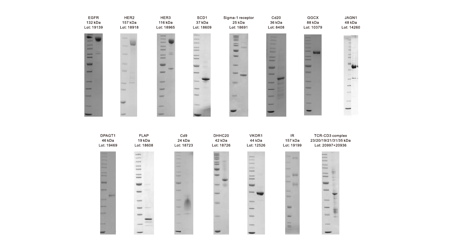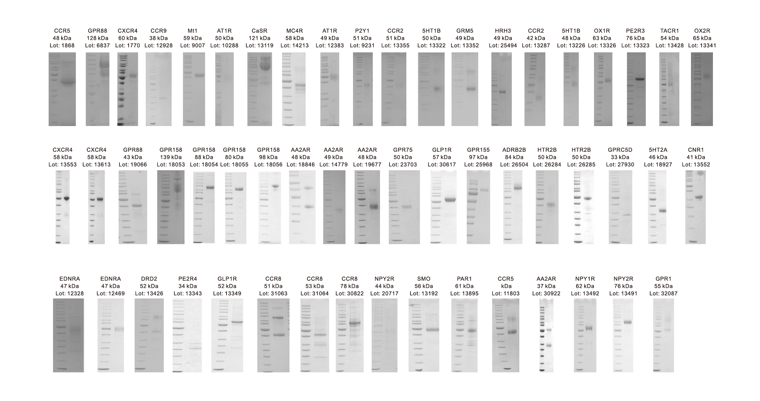 We assess the success of the screening process by utilizing techniques such as fluorescence size exclusion chromatography (FSEC), SDS-PAGE gels, Western Blot. To address the challenge of extremely low expression levels of membrane proteins, we have the capability to utilize anti-eGFP nanobody resin, which offers high specificity in capturing eGFP-tagged membrane proteins (with a dissociation constant, kd, of ~6 pM). We have successfully purified over 300 unique membrane proteins such as GPCR, ion channel, transporters by using this approach. We have a variety of membrane proteins available for purchase online. For more information, please contact us.